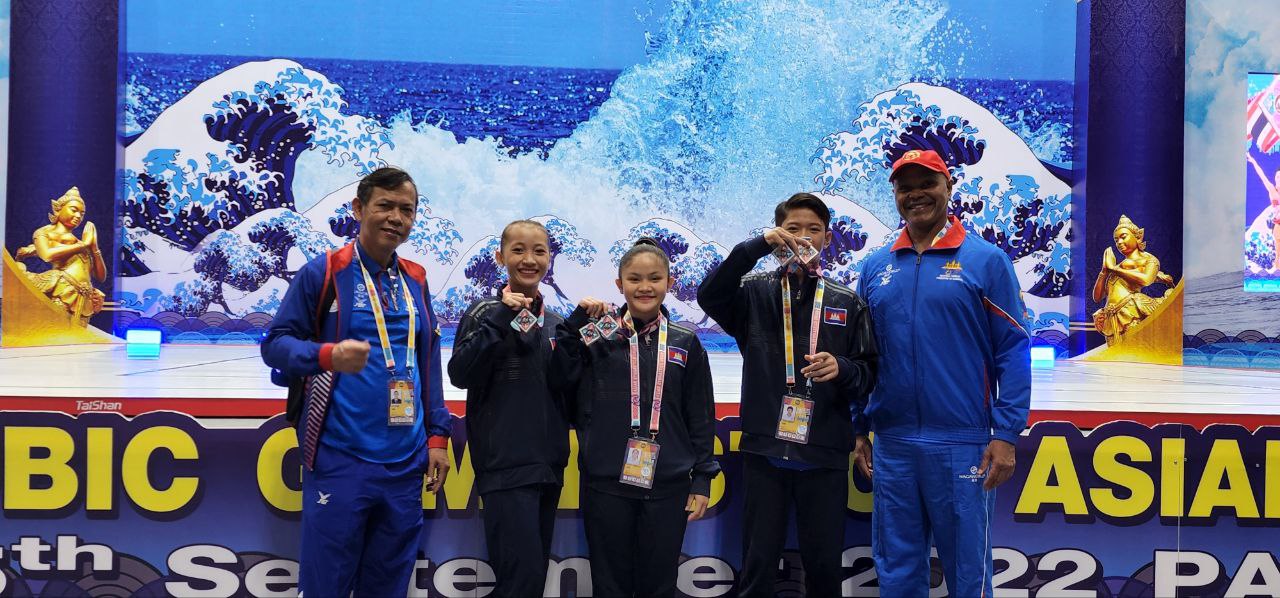 សូម ឯកឧត្តម មេត្តាទទួលនូវក្តីគោរព និងការស្រឡាញពីយើងខ្ញុំទាំងអស់គ្នាគិតត្រឹមល្ងាចថ្ងៃទី៤ ខែកញ្ញា ឆ្នាំ២០២២ម្សិលមិញនេះ អត្តពលិកកីឡាកាយសម្ព័ន្ធកម្ពុជា ដណ្តើមបានមេដាយសរុប ៣គ្រឿងហើយ ពីការប្រកួតកីឡាកាយសម្ព័ន្ធជើងឯកអាស៊ីលើកទី៧ ( Asian Aerobic championships) នៅប្រទេសថៃ។